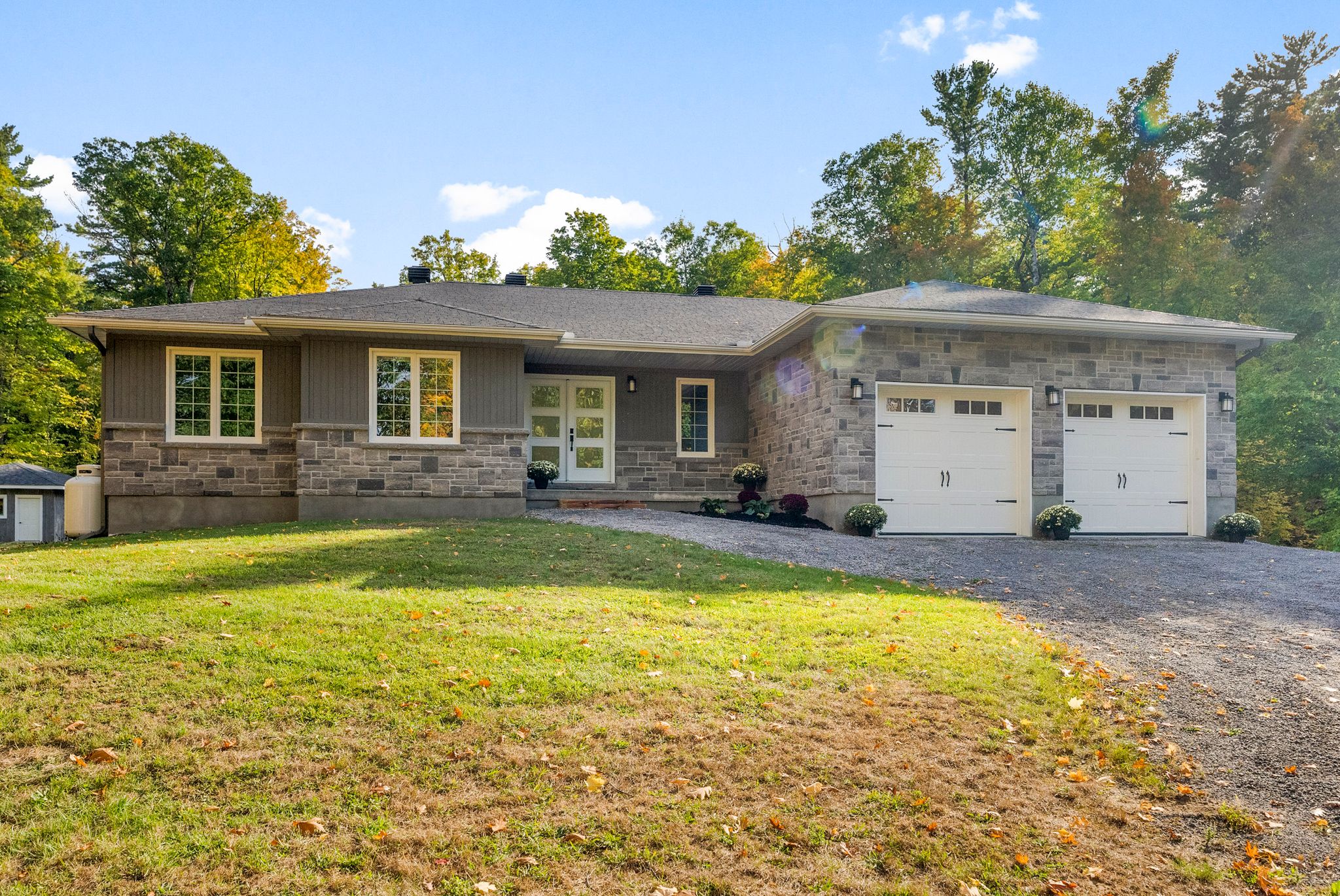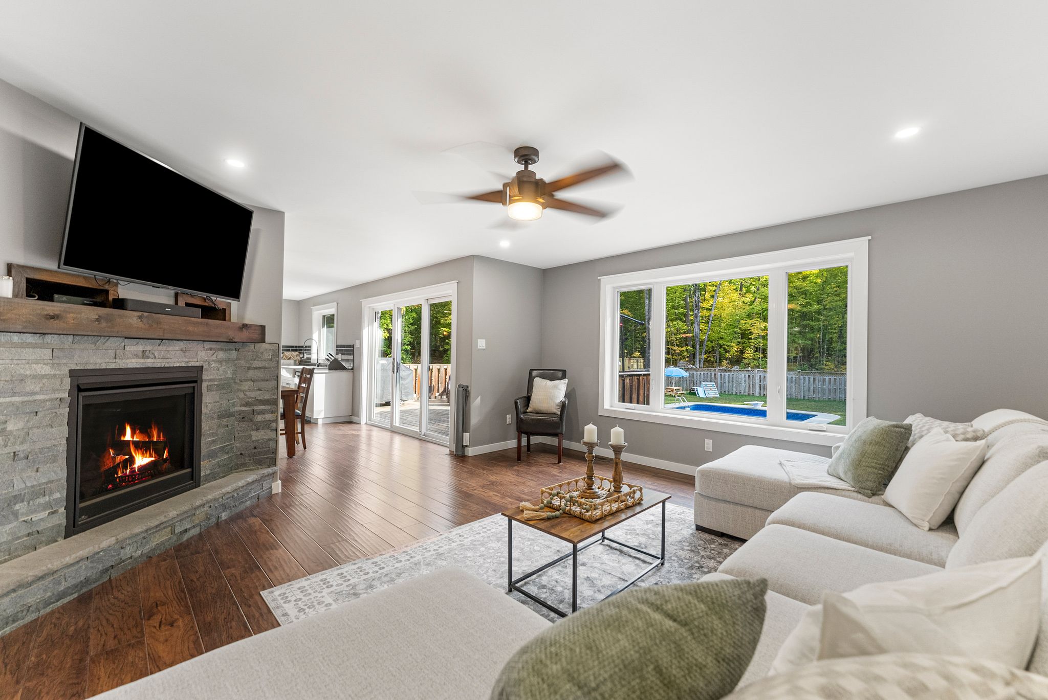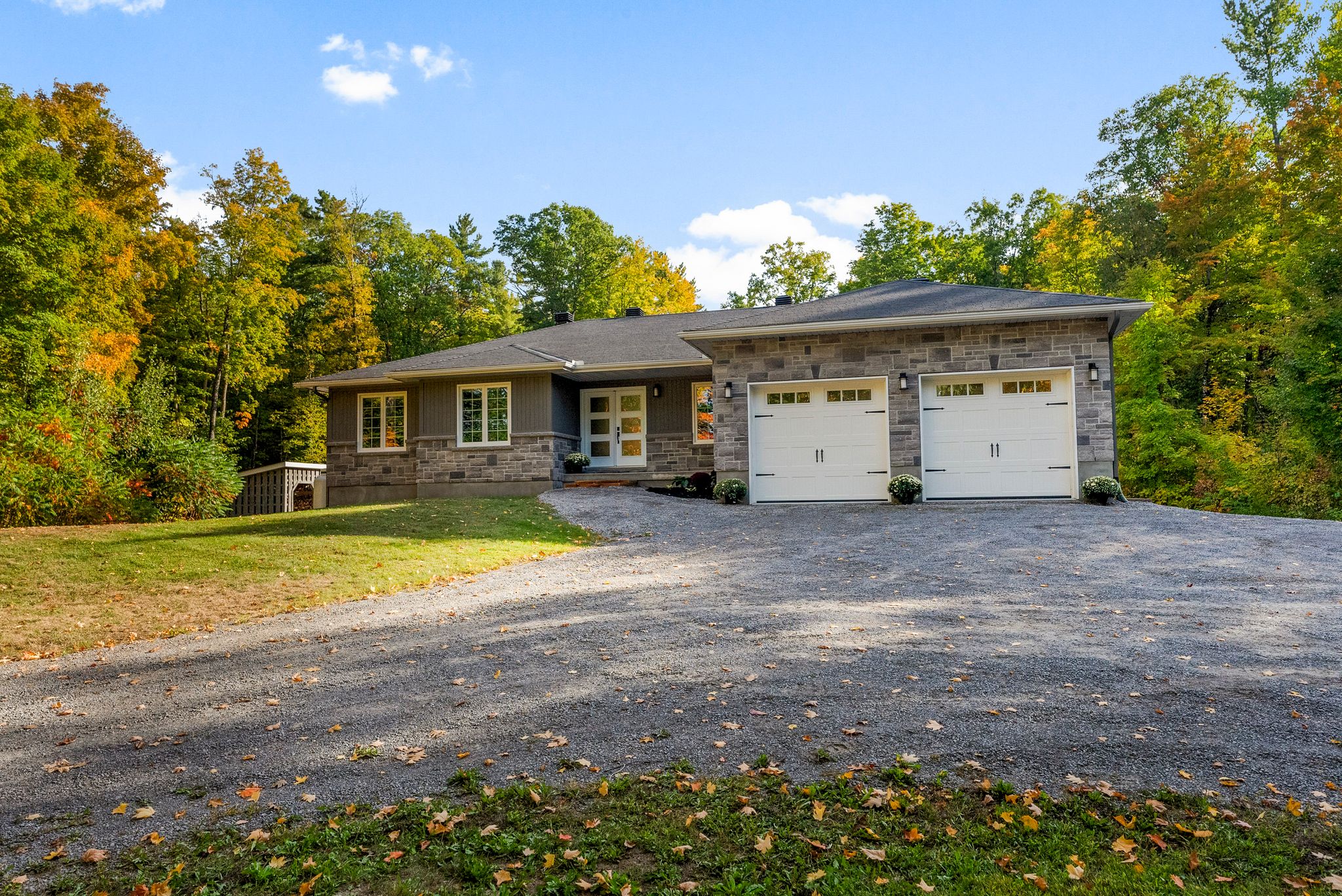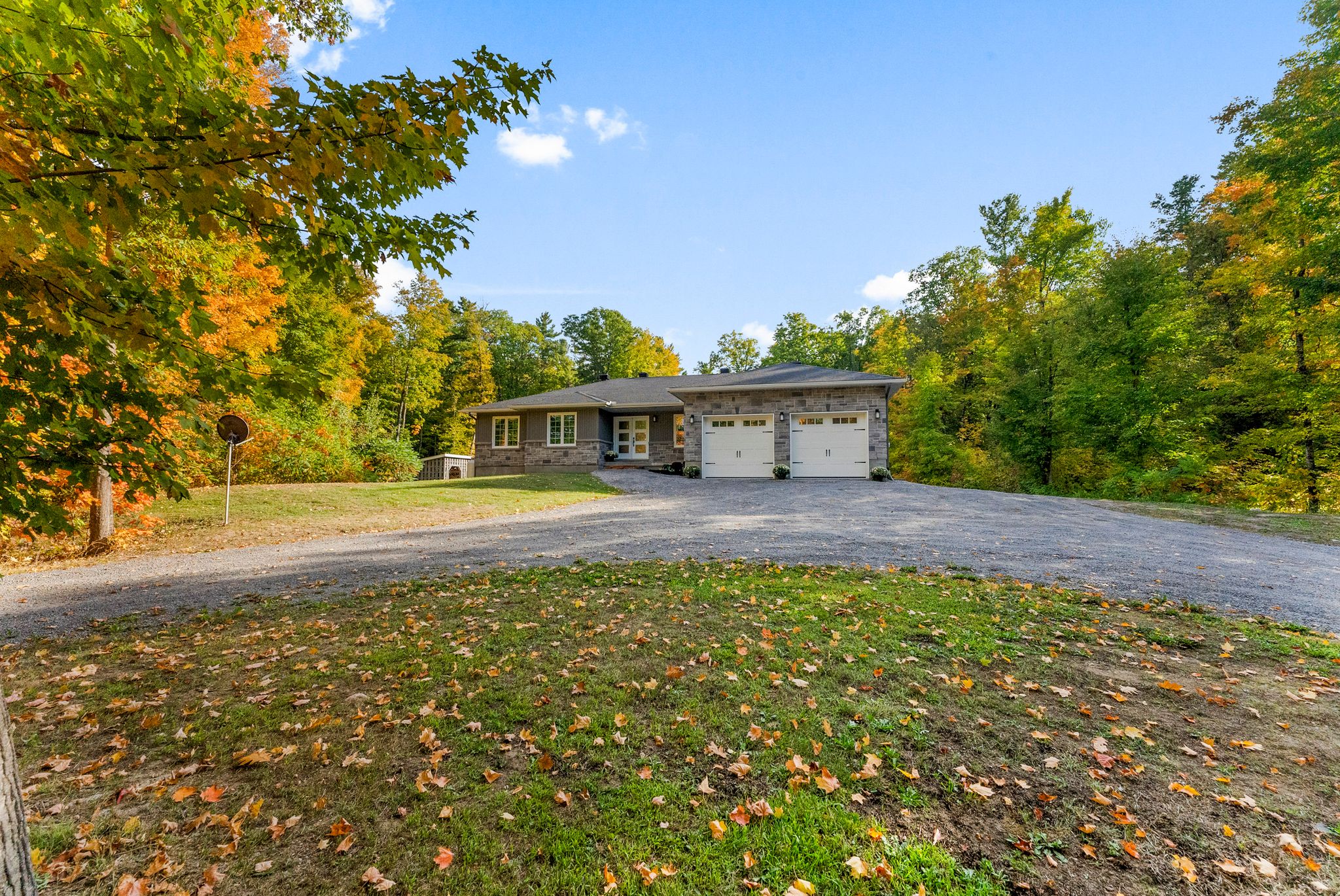 Stunning bungalow set on just over 2 acres, surrounded by mature trees and complete privacy, with water access to the Madawaska River only a short walk away – perfect for swimming, boating, and fishing! Offering over 4,000 sq. ft. of living space, this property is also ideally located just 15 minutes to Arnprior, 30 minutes to Kanata and 10 minutes to Hwy 17 for easy commuting. Step into the spacious foyer with a large coat closet, leading to an inviting open-concept layout filled with stylish finishes. The main floor features engineered hardwood and tile throughout, with a kitchen, dining, and living room designed for both family living and entertaining. The custom kitchen showcases a walk-in pantry and custom soft-close cabinetry, while the cozy gas fireplace and expansive windows create an airy, light-filled atmosphere that seamlessly brings the outdoors in. The main level offers three bedrooms and two full baths, including a serene primary suite with a walk-in closet and luxurious ensuite with in-floor heating. Convenient main floor laundry with access to the garage and ample storage! The fully finished lower level boasts 9-ft ceilings, two additional bedrooms, a large family room, games area, and a beautiful 3-piece bath. The woodstove not only supplements heat but adds a warm ambiance in winter months. Car enthusiasts and hobbyists will love the attached 2-car garage along with a separate 1-car garage providing ample storage for boats, recreational vehicles and more. Outdoor living is at its finest with direct access from the dining area to a large rear deck, overlooking the 40 x 20 heated inground pool and fully fenced area – an ideal space for children and pets – a true oasis! With quick access to nearby trails for snowmobiling and ATVing, this property combines year-round recreation with everyday convenience and offers not just a home but a life style. An exceptional home in a highly sought-after location.